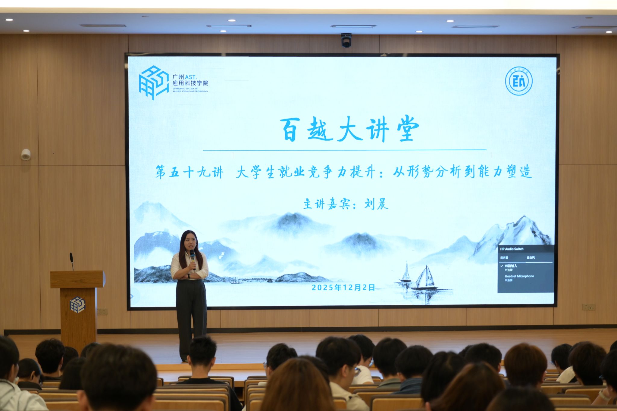 “百越大讲堂”第五十九讲于12月2日下午在图书馆一楼报告厅举行。深圳市讯方技术股份有限公司就业服务部经理,高级职业生涯规划师刘晨女士作《大学生就业竞争力提升—从形势分析到能力塑造》专题讲座,数智产业学院(华为ICT学院)300余名师生参加讲座。