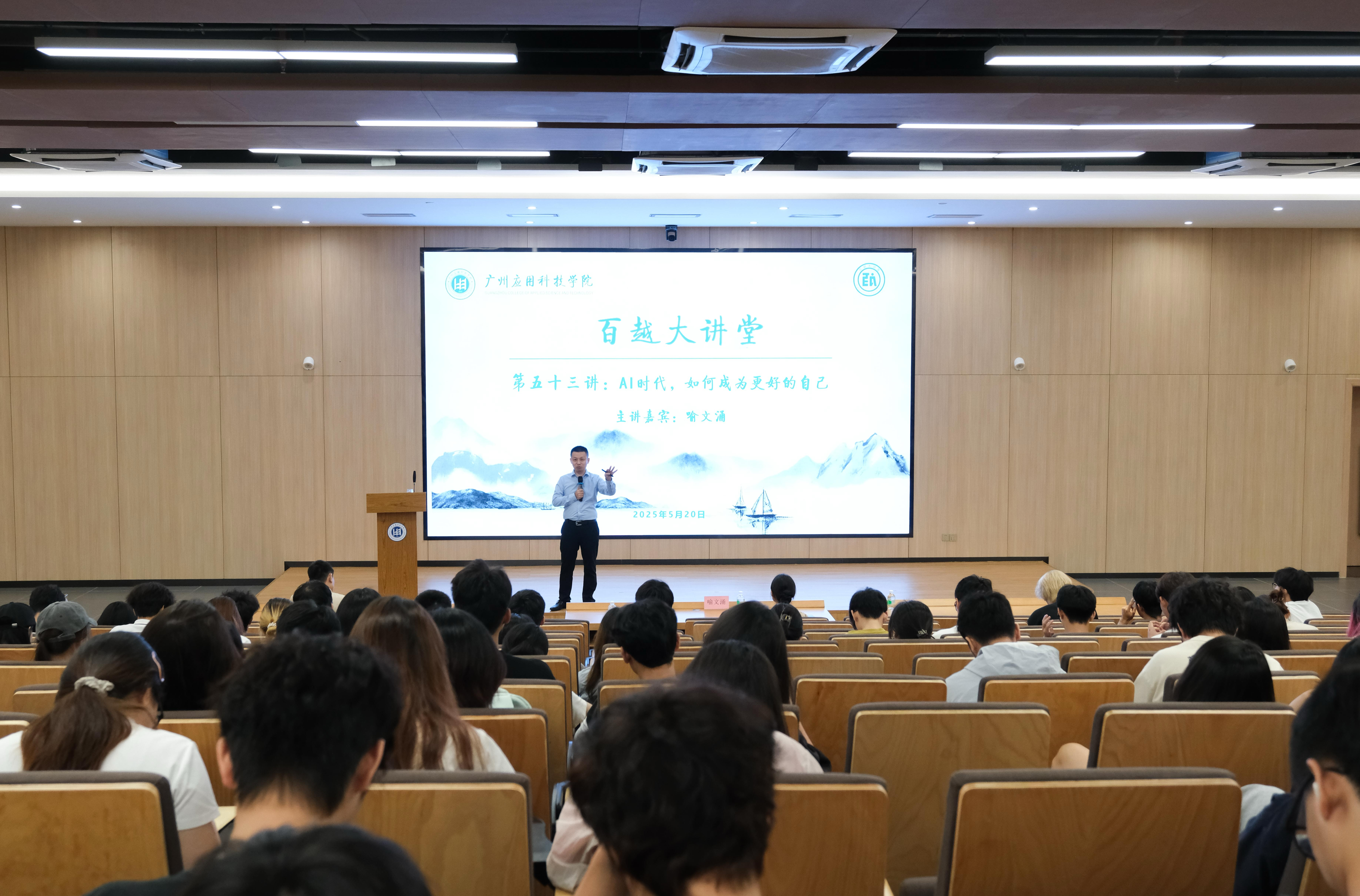 百越大讲堂”第五十三讲于5月20日在图书馆一楼报告厅举行,尊一科技集团总裁喻文涌应邀为我校师生作《AI时代,如何成为更好的自己》专题讲座。校团委书记郭振及300余名师生参加讲座,讲座由郭振主持。 喻文涌以自身成长经历开篇,...
