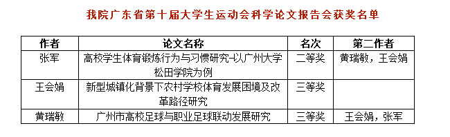松田网讯(记者:黄佩珊 通讯员:张军 王会娟)5月24至26日,广东省第十届大学生运动会科学论文报告会(以下简称科报会)在深圳大学元平体育馆举行,社会体育系获奖教师张军、王会娟、黄瑞敏参加了此次科报会。 &...