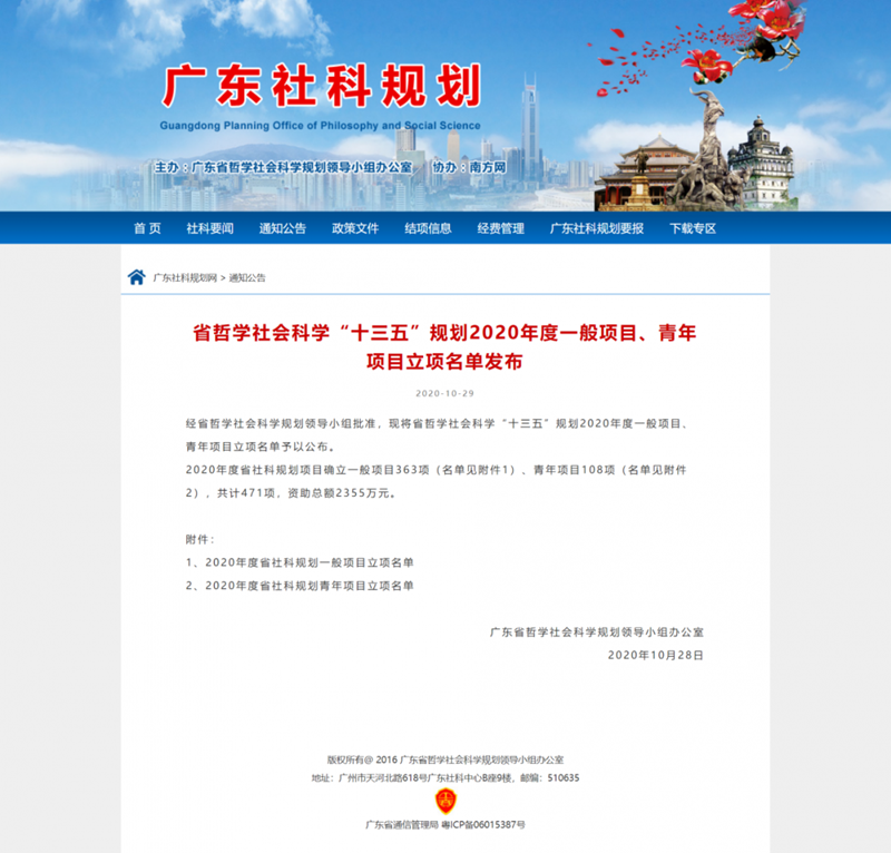 10月28日,广东省哲学社会科学规划领导小组办公室公布了《省哲学社会科学“十三五”规划2020年度一般项目、青年项目立项名单发布》。经省哲学社会科学规划领导小组批准,我校社会体育系黄东怡老师的《视觉重构理论视域下岭南民族传统体育文化数字化传播策略研究》...