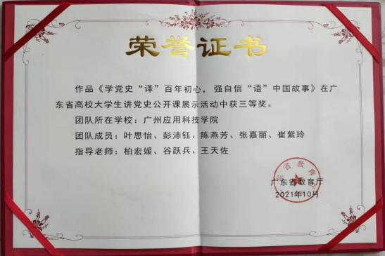 近日,由广东教育厅主办的《高校思政课党史教育优质课例和大学生讲党史公开课征集展示活动》评比结果公布。由马克思主义学院柏宏媛、王天佐、谷跃兵老师指导,外语学院叶思怡、彭沛玉、陈燕芳、张嘉丽、崔紫玲5名同学的参赛作品《...