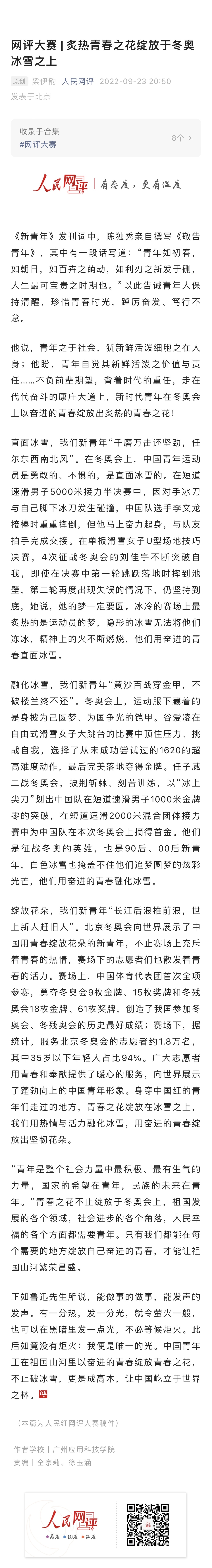 奋进是青春的底色,是青年人的本色。复兴征途漫漫,惟有奋进能让青春的我们自强不息、开拓创新、担当使命;复兴征途漫漫,惟有奋进能让青春的我们不负时代不辱使命,推动实现中华民族伟大复兴的历史进程。20级新闻学专业梁依韵同学参加人民网举办的网评大赛,...