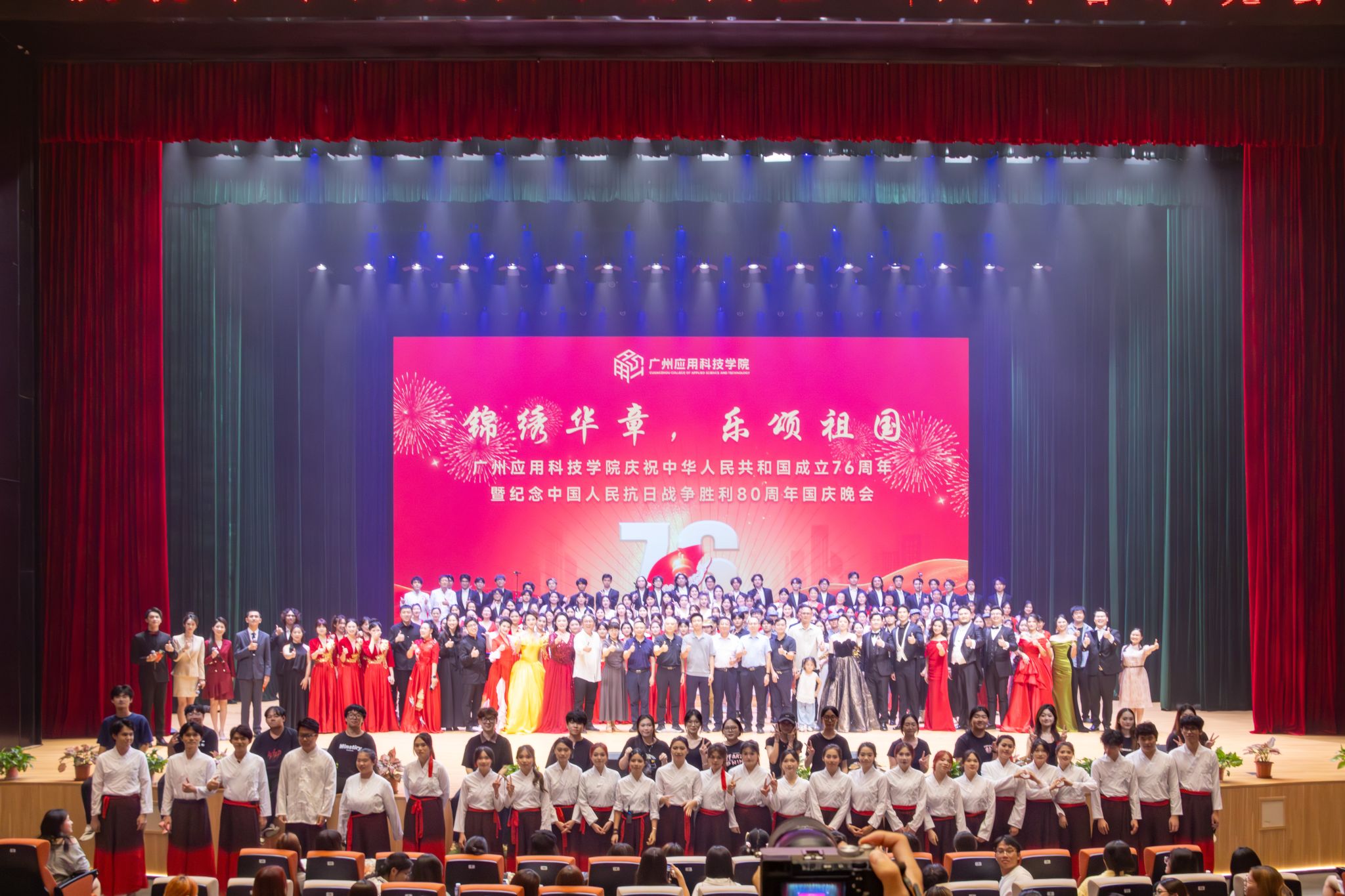 金秋送爽,岁月如歌。在庆祝中华人民共和国成立76周年暨纪念中国人民抗日战争胜利80周年之际,广州应用科技学院于9月29日晚在肇庆校区莲花大剧院隆重举行“锦绣华章,乐颂祖国”国庆专场音乐会。鼎湖区委常委、鼎湖区委宣传部部长林坚,学校董事长王睿、校长张光宇、党委书记陈光团等董事会、党政校领导班子出席并和师生代表共同观看晚会。国庆音乐晚会由学校党委宣传部主办,音乐学院承办,以艺术为载体,落实立德树人根本任务,展现广应科师生昂扬向上的精神风貌,...
