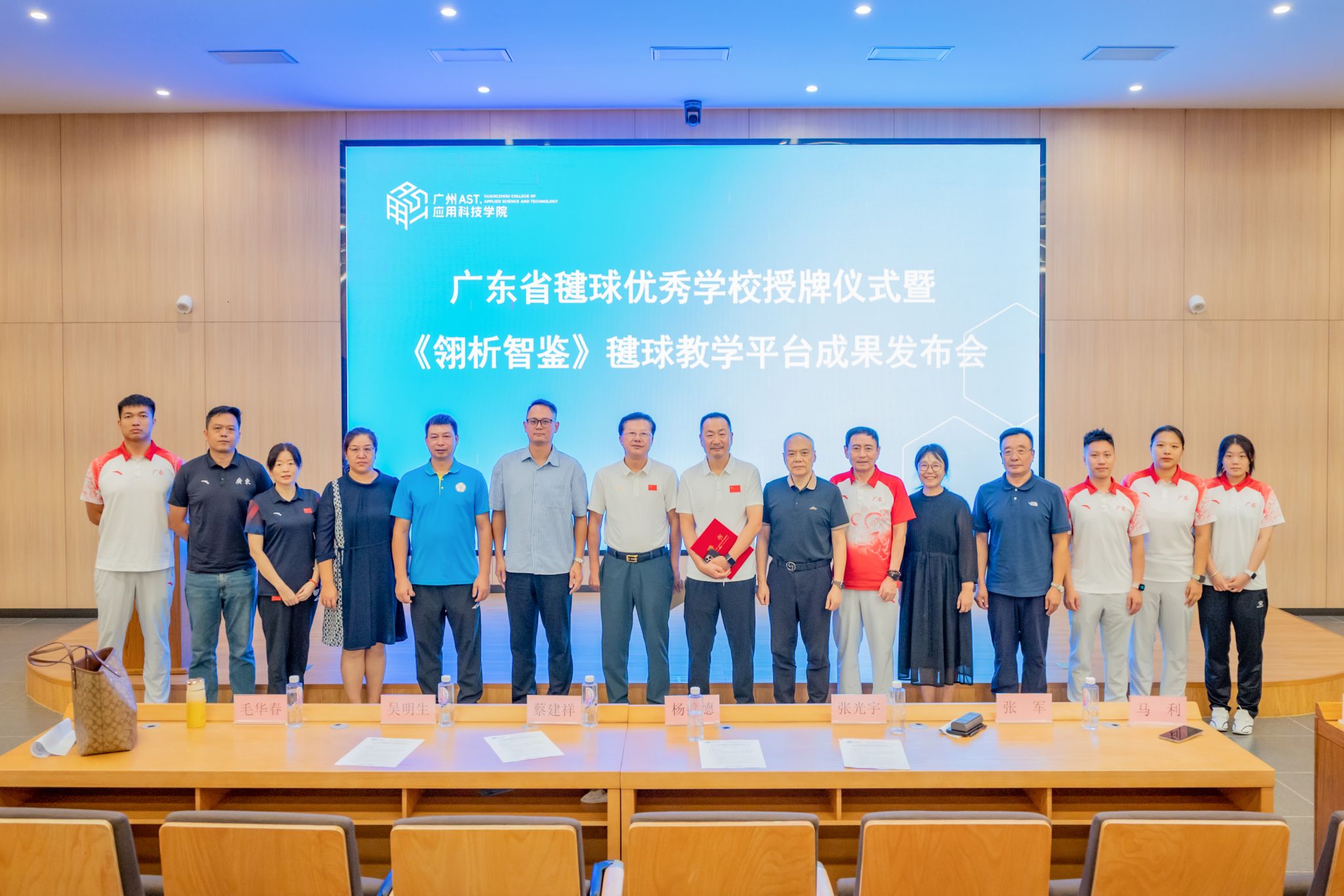 10月16日,广州应用科技学院肇庆校区图书馆一楼报告厅内嘉宾云集,“广东省毽球优秀学校”授牌仪式暨《翎析智鉴》毽球教学平台成果发布会在此隆重举行。中国毽球协会主席、全国跳绳推广委员会主任杨善德,广东省社会体育和训练竞赛中心主任蔡建祥,广东省毽球运动协会秘书长毛华春,学校校长张光宇、校长助理吴明生,以及综合办公室、党委宣传部、教务处、学生处、校团委负责人,中国毽球跳绳协会副主席、广东省毽球运动协会常务副会长、...