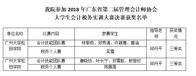 松田网讯(记者:黄佩珊 通讯员:谷跃兵)金秋送爽,青春作伴。11月9日至10日,我院管理学系教师邱丹平代表学院带领会计学专业两支队伍,参加2018年广东省第二届“福思特杯”大学生会计税务实训大赛,经竞赛评审委员会评定,...