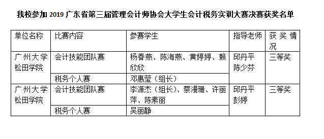 松田网讯(记者:黄佩珊 通讯员:邱丹平)青春作伴,迎难而上。12月7至8日,我校经济与管理学院会计系教师邱丹平、陈少芬代表学校带领会计学专业两支队伍,参加2019年广东省第三届“福思特杯”大学生会计税务实训大赛,...