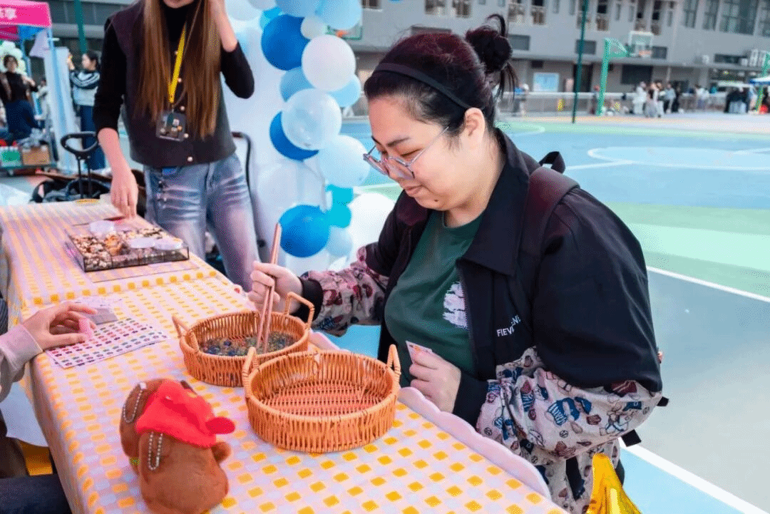 “帮我看看这两个颜色搭不搭?”“你编得好好看,教教我”的对话此起彼伏。DIY创作摊位前热闹非凡,大家围坐桌前,将颗颗彩珠穿入丝线,亲手制作独属于自己的手链,每一件作品都藏着创作者的巧思,现场始终充满专注与欢笑。一颗颗彩珠、一串串手链,不仅是手工创作的成果,更是女生们与彼此、与自己的温柔对话。