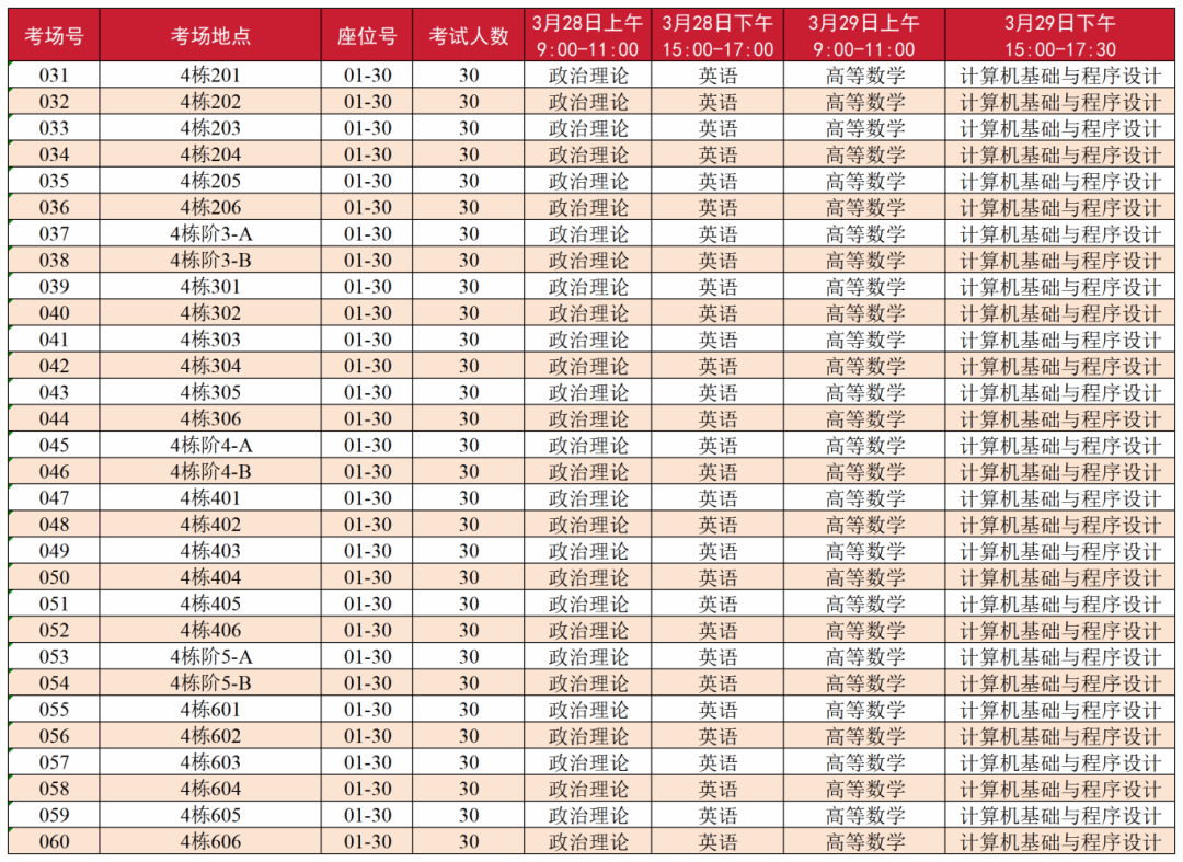 本次考试考场设在第3栋教学楼(001-030考场)、第4栋教学楼(031-060考场)和第10栋教学楼(061-100考场),具体分布如下: