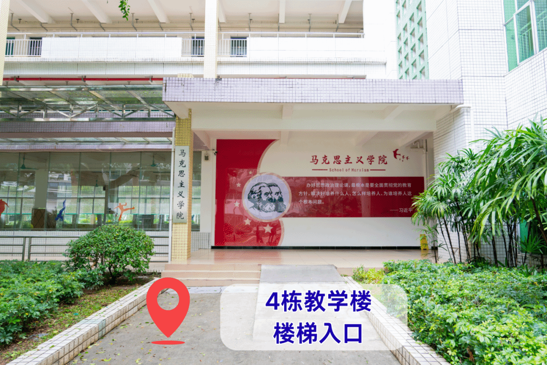 进校后直行,绕花坛环后上坡直行,途经第10栋教学楼后沿着中间通道继续前行约40米,即可到达第4栋教学楼。