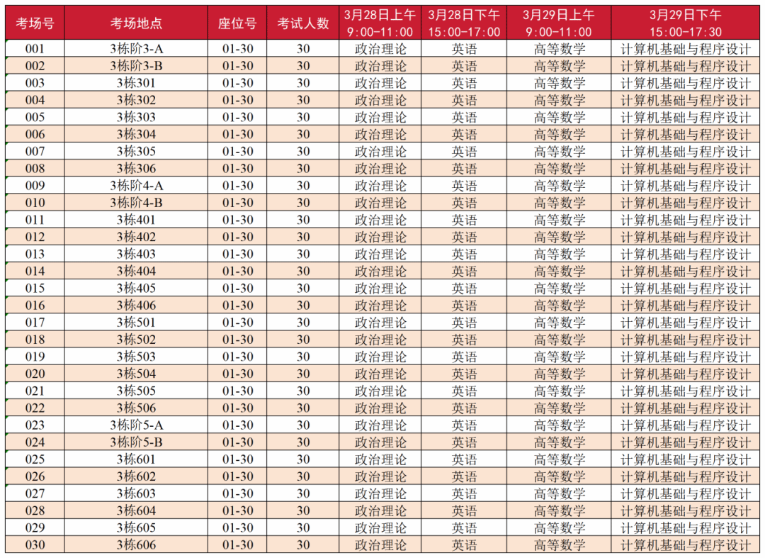 (一)第3栋教学楼考场号:(001-030)