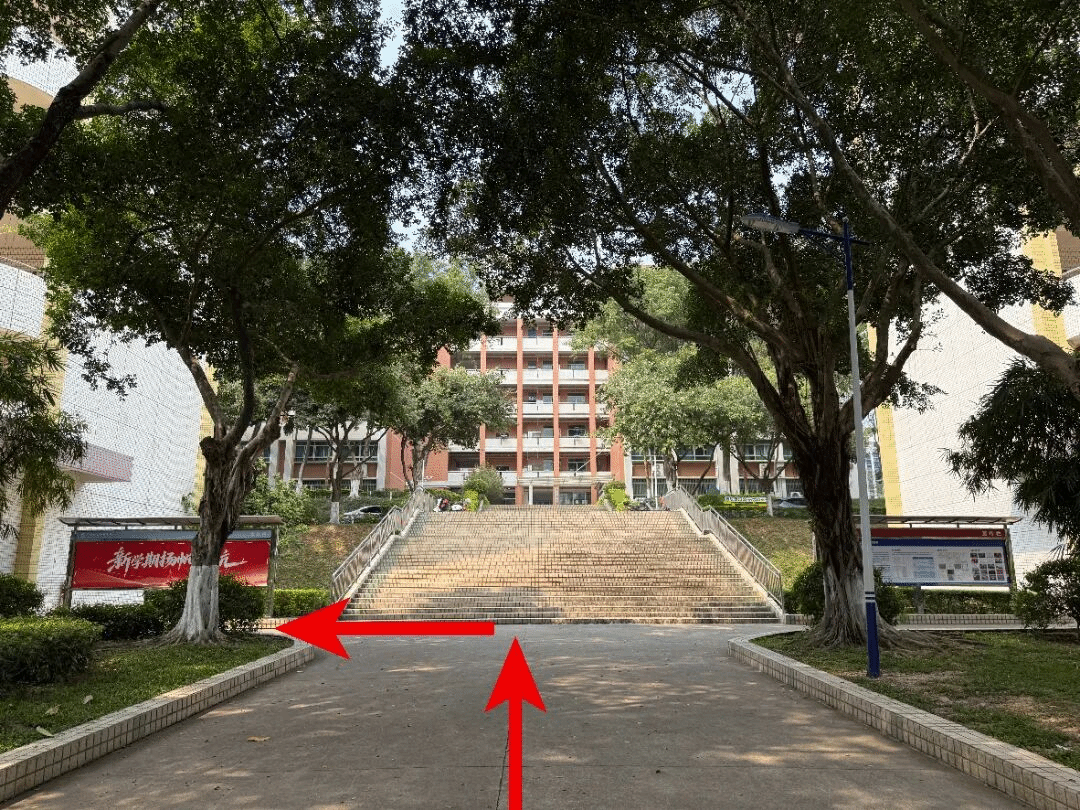 进校后直行,绕花坛环后上坡直行,在第10栋教学楼后沿着中间通道继续前行约40米,即可到达第3栋教学楼。