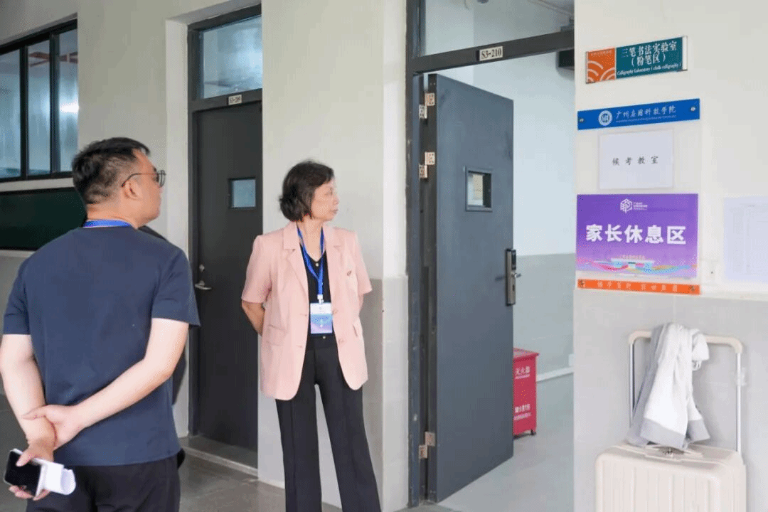 在严谨规范的考务组织之外,学校坚持标准化考务与人性化服务并重。考点设置咨询点、医务站,安排专业医护人员全程值守,配备常用药品和急救设备,及时应对考生突发健康状况;优化入校路线与候考环境,在校园主要路口、考场周边设置清晰指引标识,安排志愿者分段引导;候考区配备休息座椅、饮用水等物资,为考生提供舒适候考条件。从入校引导、考场检录到应急保障,全流程为考生保驾护航,充分展现广应科作为标准化考点的责任与担当。