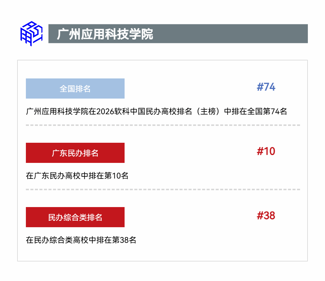 近日,高等教育专业评价机构软科正式发布“2026软科中国大学排名”。在备受关注的中国民办高校排名(主榜)中,广州应用科技学院(以下简称“广应科”)凭借强劲的发展势头与扎实的办学实力,位列全国第74名,位列全国民办综合类大学第38名,位列广东民办高校第10名。