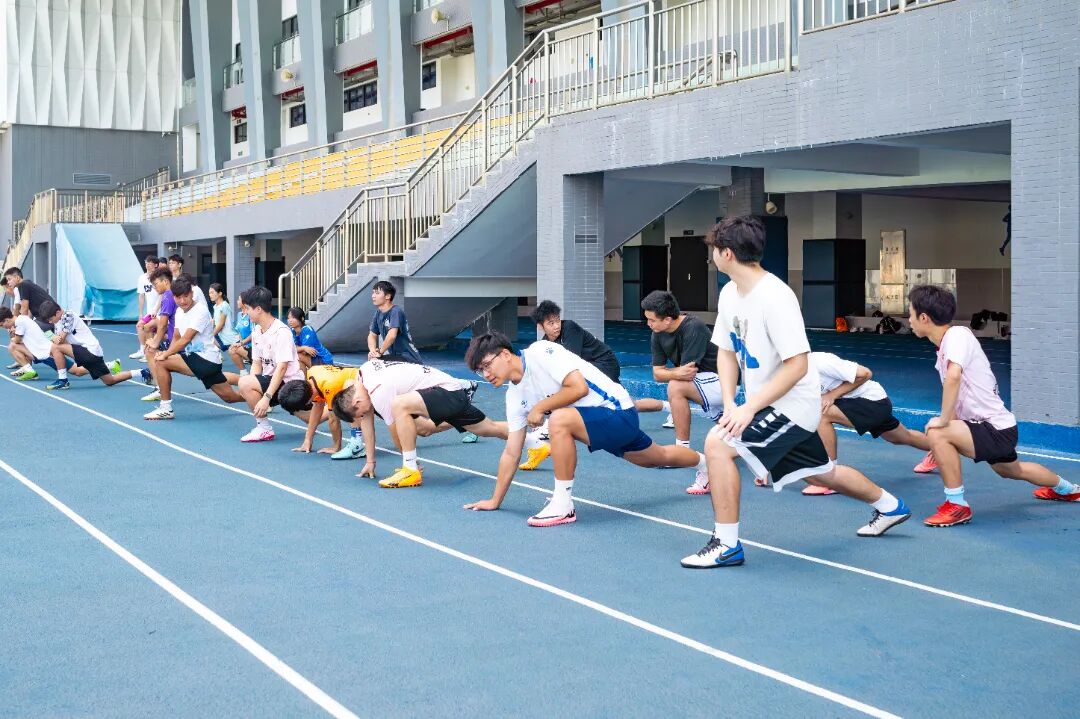 操场上,晨跑的同学迎着微风挥洒汗水;篮球场上,一场友谊赛正激烈进行;体育馆内,毽球、羽毛球、乒乓球的击打声不绝于耳。体育老师们也早早到位,带领大家开展新学期的第一堂体育课——“强健的体魄,是一切奋斗的基础。”