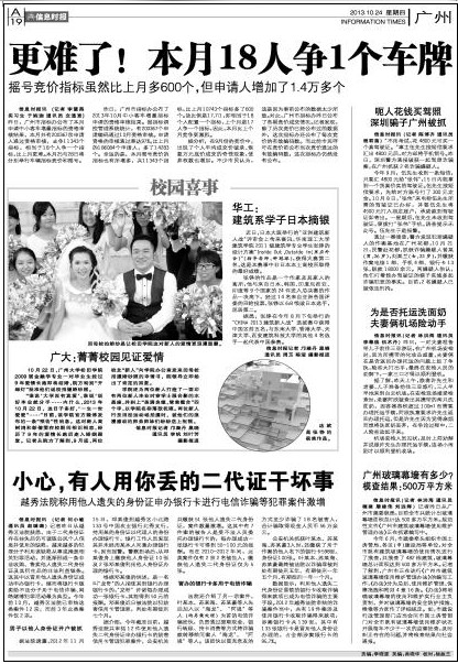 松田网讯(记者:李帆 报道)10月24日,《信息时报》A19版刊登消息,《广大:菁菁校园见证爱情》,图文报道我院09届校友高树鸿和彭倩雯在校期间相识相恋,经过9年爱情长跑即将结婚,院方特别“开绿灯”批准他们返校拍摄婚纱照。