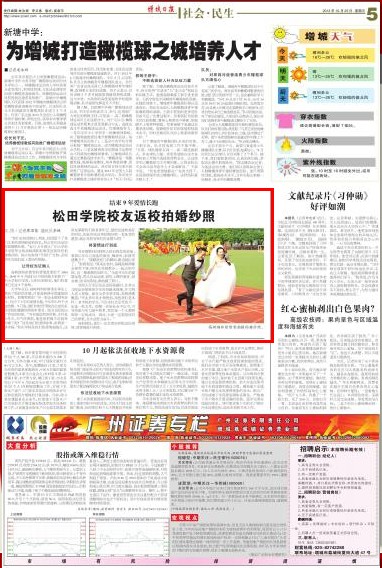 松田网讯(记者:李帆 报道)10月25日,《增城日报》第七版刊登消息《结束9年爱情长跑松田学院校友返校拍婚纱照》。