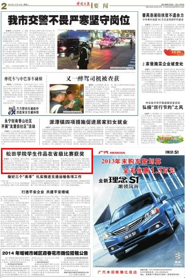 松田网讯(记者:李帆 报道)12月18日,《增城日报》第二版刊登消息《松田学院学生作品在省级比赛获奖》,报道我院一学生设计作品《婴儿游泳圈》参加“2013年广东省高等学校工业设计大赛”,荣获三等奖。