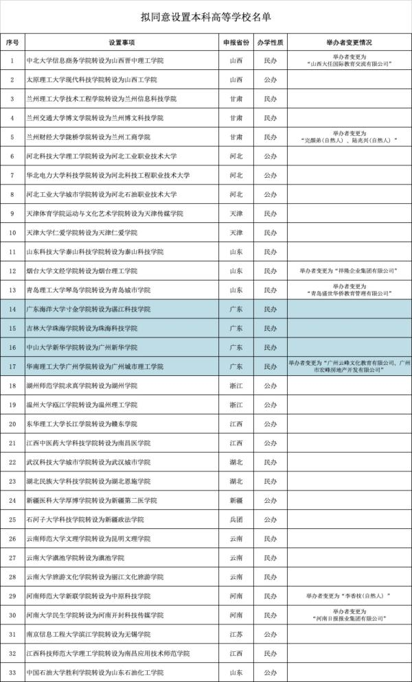 其中广东有4所独立学院拟转设,分别为:广东海洋大学寸金学院转设为湛江科技学院,吉林大学珠海学院转设为珠海科技学院,中山大学新华学院转设为广州新华学院,华南理工大学广州学院转设为广州城市理工学院(举办者变更为“广州云峰文化教育有限公司、广州市宏峰房地产开发有限公司”)。