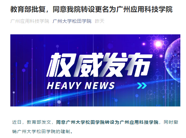 近日,教育部近日发文,同意广州大学松田学院转设为广州应用科技学院,同时撤销广州大学松田学院的建制。