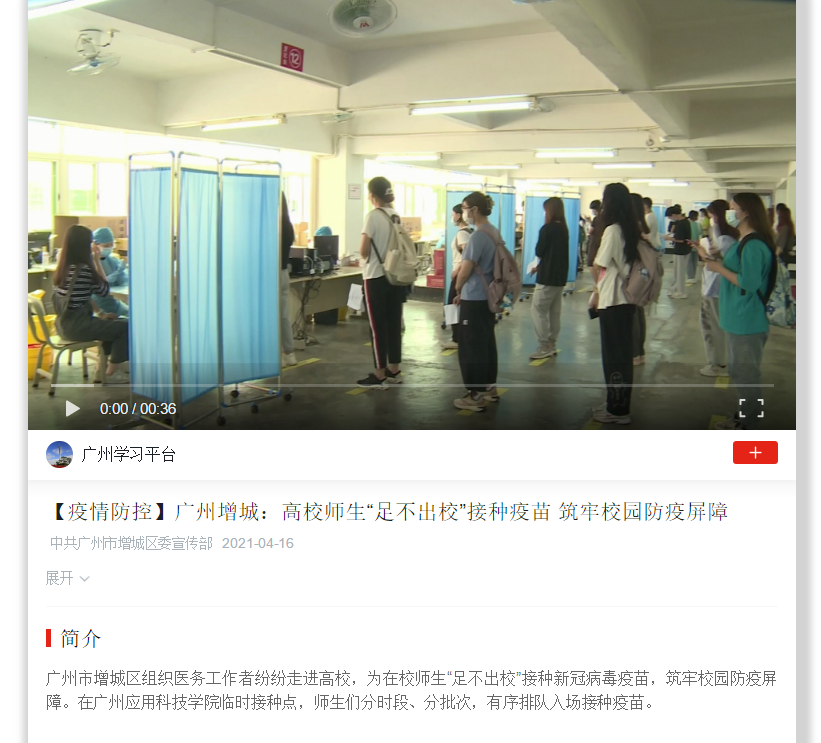 4月16日,“学习强国”广东学习平台发布了我校疫苗临时接种点的视频宣传。