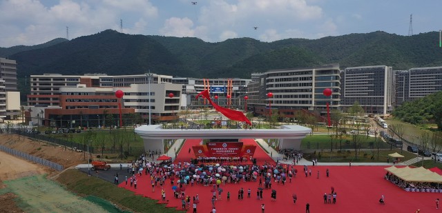 落成典礼当天上午,来自广东省教育厅、肇庆市、兄弟院校和中国教育集团控股有限公司的领导嘉宾出席仪式,学校全体教职员工和学生代表、施工建设单位代表近千人共同见证这一庄重热烈的重要时刻。伴随着领导嘉宾启动电动按钮,两架科技感十足的无人机腾空跃起,高高擎起红色幕布,为广州应用科技学院肇庆校区大门正式揭牌。