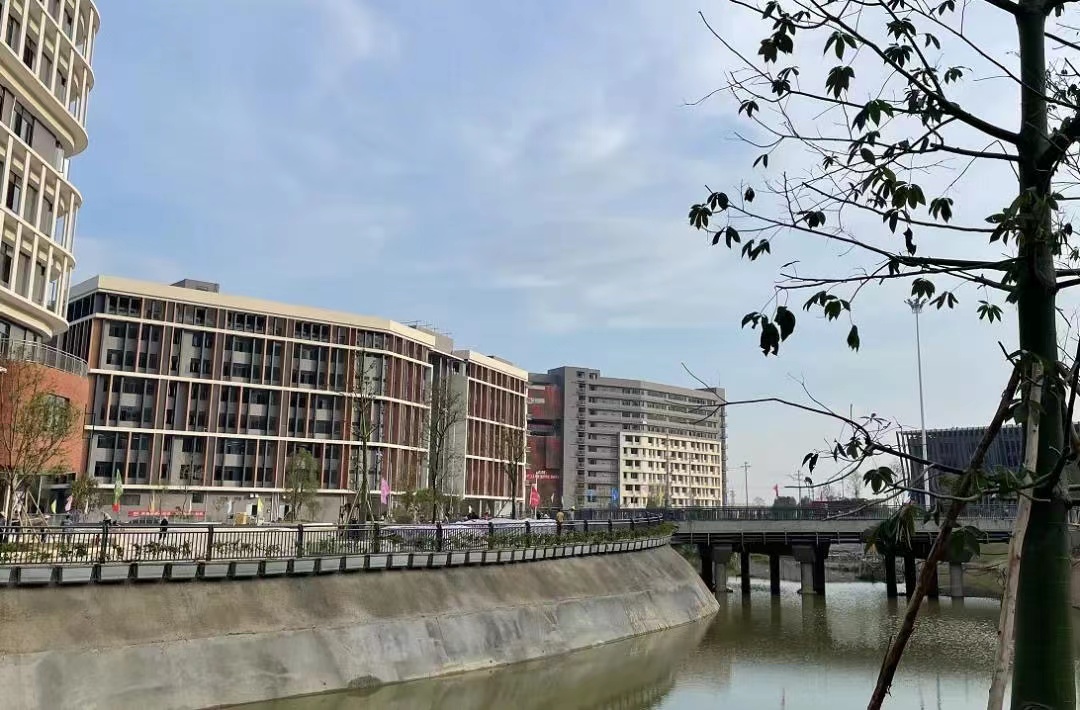目前,肇庆校区不仅修建了亲水平台和步行栈道,同时建设了两座跨河桥,以及一座风雨连廊,融合师生在南岸和北岸的生活学习。其中,风雨连廊连接丰乐渠两岸的教学大楼和学生公寓、饭堂和商业中心,可便于学生往返通行和打卡休闲。