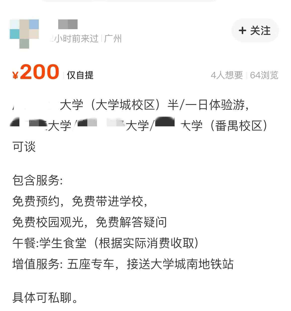 声称是另一所广东“双一流”高校学生的卖家则介绍,60元可以带进、带逛校园。谈及这样做的初衷,该卖家表示,自己在学校带游客进来很方便,想赚点奶茶钱,但目前来询单的人寥寥无几,还没有人真正拍下这项服务。“现在暑假准备回家了,等我8月底回学校,随时都可以拍下。”