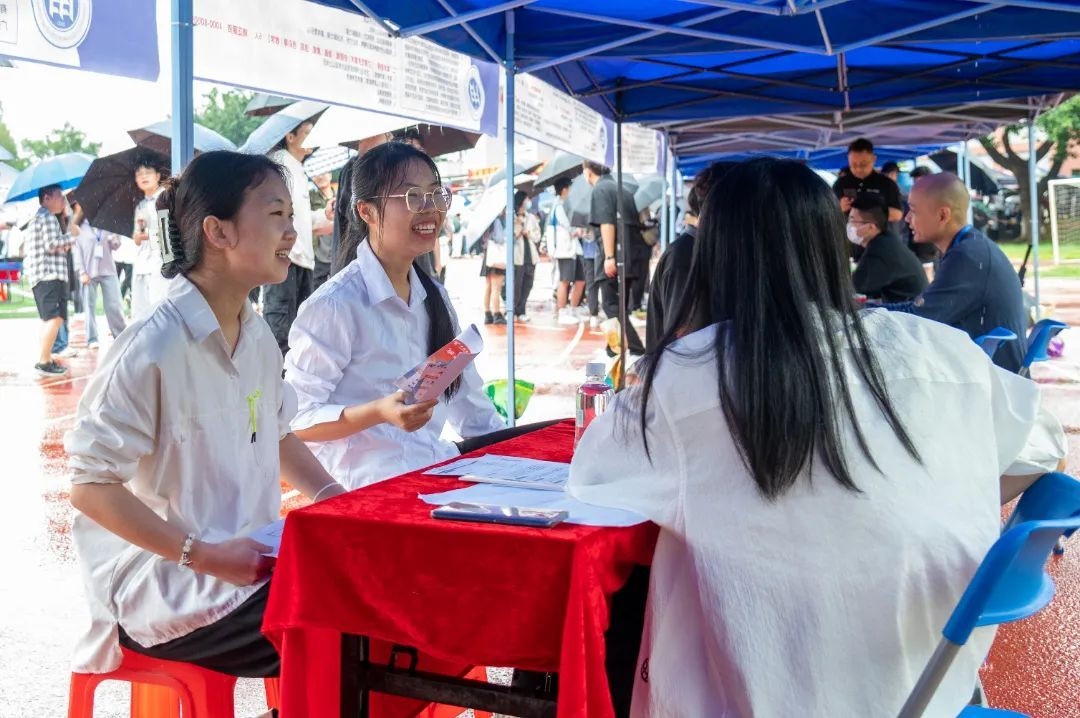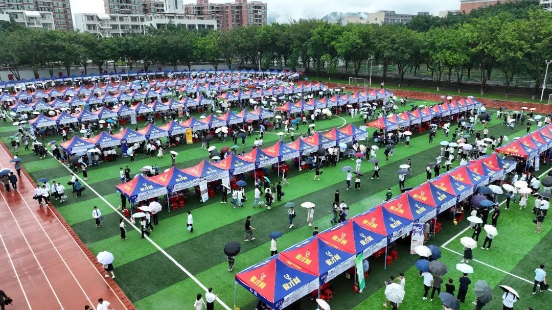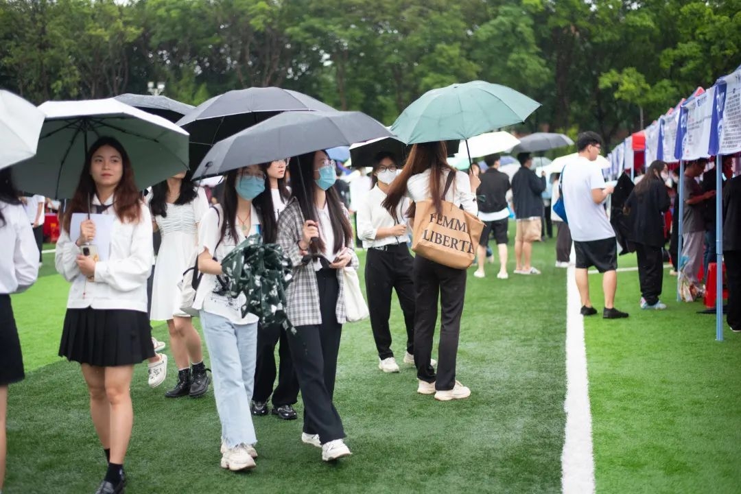 招聘会当天,天空持续下着雨,但阻挡不了前来应聘的高校毕业生,广州应用科技学院广州校区足球场人头攒动。招聘会现场气氛热烈,共有6000多人进场应聘,其中包括来自学校周边17所高校近1000多名学生进场参加。毕业生们手持简历,与心仪的招聘单位负责人面对面交流。