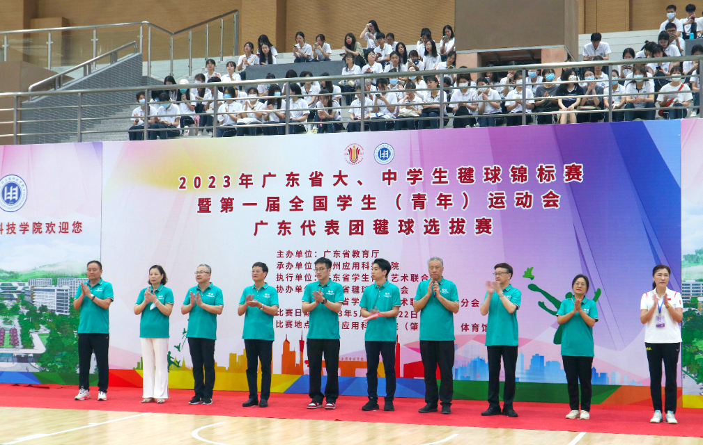 广东省学生体育艺术联合会大学生竞赛负责人倪健铭,广州应用科技学院董事长王睿,校长刘剑锋,执行校长庞永师,党委书记王永云,副校长李江凌,党委副书记刘志新,副校长李荆松,中国毽球协会副主席、广州应用科技学院体育科技学院院长张军,广东省毽球运动裁判委员会主任、本次毽球锦标赛裁判长龙明等出席本次开幕式,共同为2023年广东省大中学生毽球锦标赛开幕式开球。