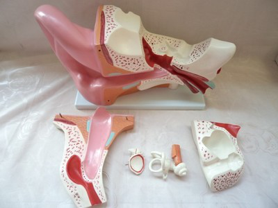 XM-425眼球构造放大模型在上颌骨上方将眼球水平切,由眼球壁巩膜、脉络膜上、下半侧、角膜、晶状体和玻璃体等8个部件组成,并显示眼球壁巩膜、角膜、虹膜、睫状体、脉络膜和视网膜的构造以及眼球内容物、眼球外肌、血管和神经等结构。