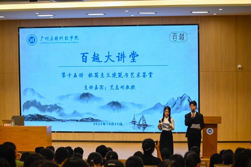 “百越大讲堂”第十五讲于10月25日下午在图书馆一楼报告厅举行。深圳市注册建筑师协会会长、深圳大学艾志刚教授应邀为我校师生带来《极简主义建筑与艺术》专题讲座。学校校长刘剑锋、副校长刘志新、建筑与设计学院院长曹伟等领导出席讲座,600余名师生通过线上线下的方式聆听讲座。讲座由建筑与设计学院院长曹伟教授主持。
