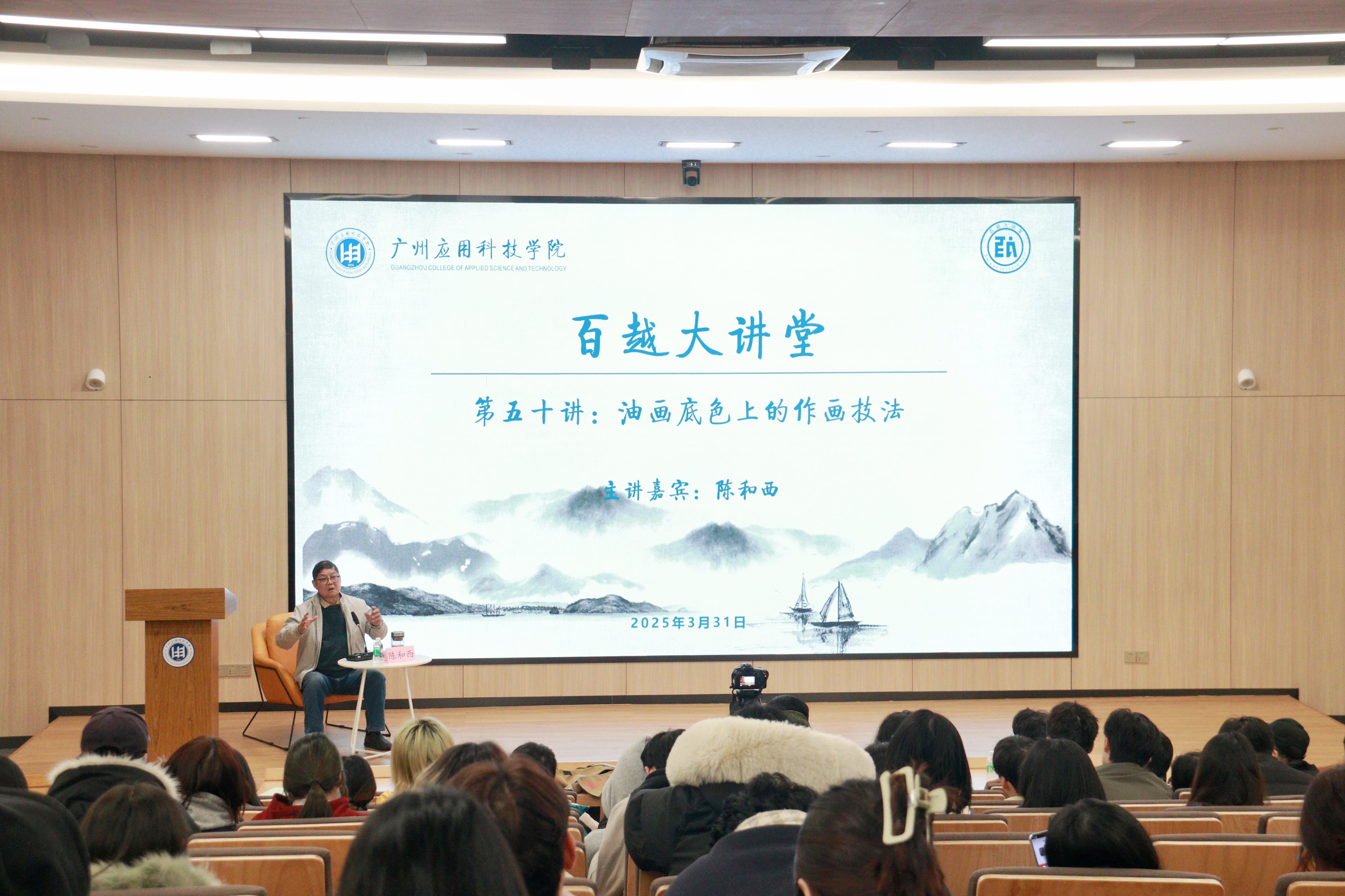 3月31日下午,“百越大讲堂”第五十讲在图书馆一楼报告厅举行,湖南师范大学美术学院教授、博士生导师陈和西应邀为我校师生作《油画底色上的作画技法》专题讲座。广州应用科技学院美术创意学院院长贺锋林、党委书记邓铨、副院长孙强以及300余名师生参加讲座,讲座由贺锋林院长主持。