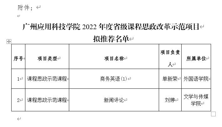 根据《广东省教育厅关于强化课程思政建设一流课程的意见》和《广东省教育厅关于开展2022年课程思政改革示范项目遴选认定工作的通知》文件精神,我校开展了省级课程思政建设改革示范项目的评审工作。经各二级学院申报、专家评审,决定推荐《商务英语(1)》和项目《新闻评论》参加省级课程思政改革示范项目评审,现予以公示。