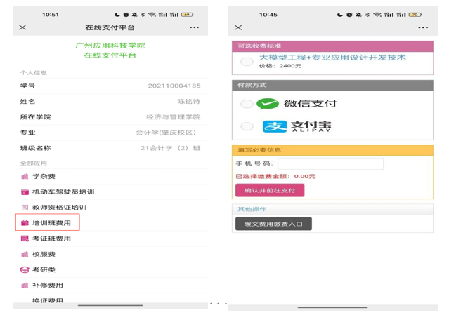 注:点击【校园服务】-【新生缴费】或【老生缴费】,如果没有绑定过信息,进入【账号绑定】-【姓名证件绑定】,输入姓名、证件号、验证码后点击绑定账号。绑定成功后点击【自助缴费】进入在线支付系统,【培训班费用】选择“大模型工程+专业应用设计开发技术”,选择微信或支付宝,录入手机号码后确认支付即可。