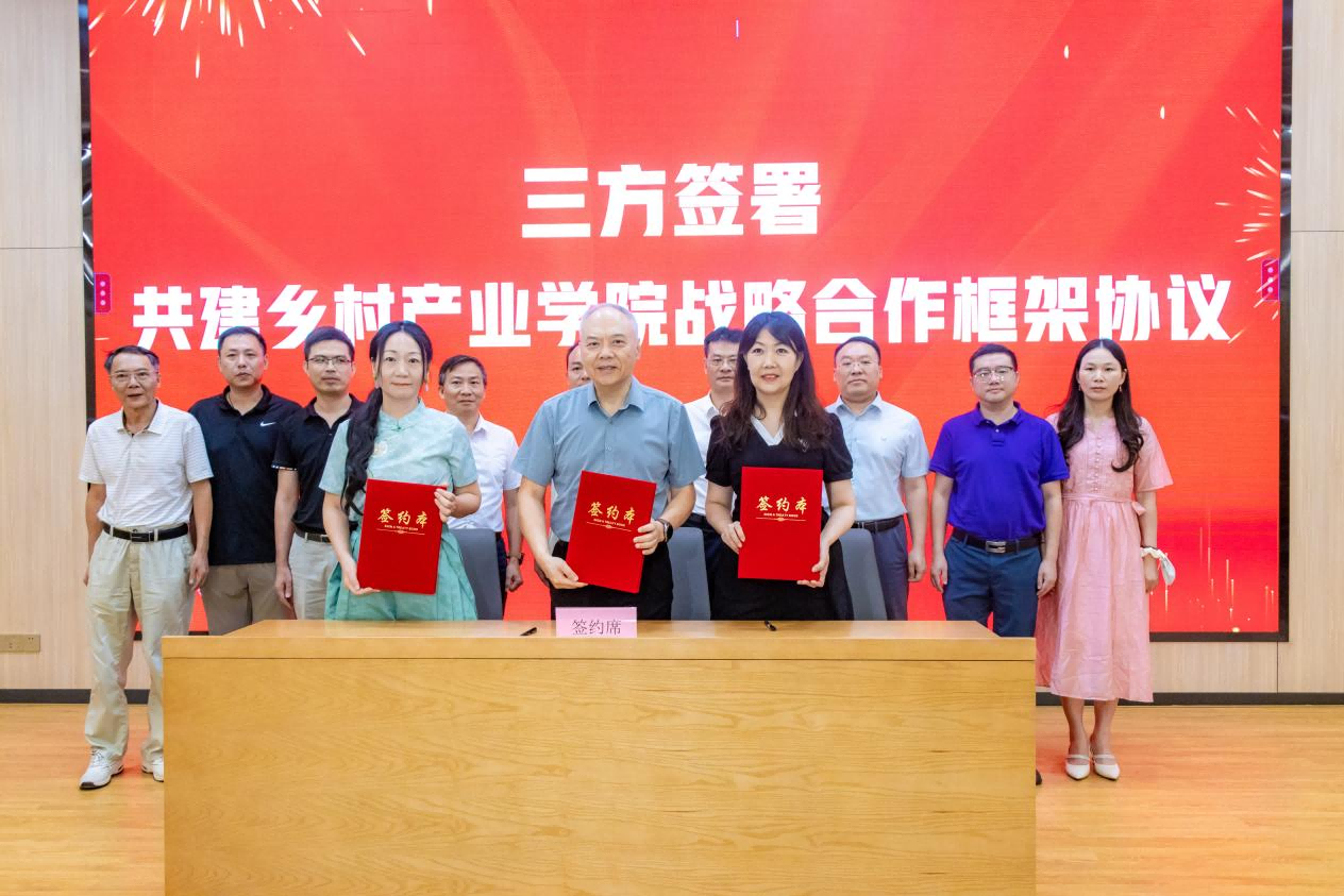 仪式上,广州应用科技学院执行校长张光宇、广州乡村振兴控股集团有限公司执行董事麦愈强、广东省职业经理人协会会长谢小夏作为代表,共同签署了共建乡村产业学院战略合作框架协议。
