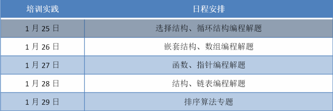 培训内容循序渐进,首日从结构化程序设计的基本内容开始,围绕三种基本控制结构展开教学。随着课程的推进,逐渐深入到多维数组、函数指针、结构体链表等进阶内容。