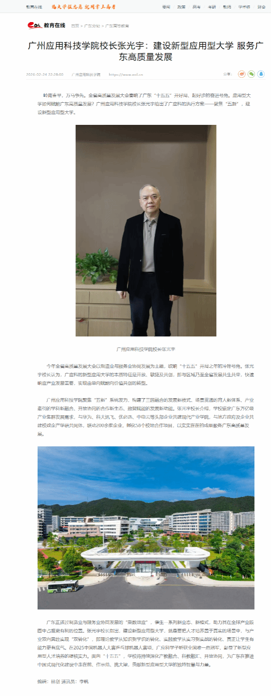 2月24日,正月初八,广东省高规格召开“新春第一会”——全省高质量发展大会,擘画“十五五”开局新篇。大会甫一结束,广州应用科技学院校长张光宇接受南方日报、广州日报、中国教育在线等主流媒体专访,第一时间发出“广应科声音”,以“建设新型应用型大学”的清晰定位和“聚焦‘五新’系统发力”的务实方案,积极响应大会关于制造业与服务业协同发展的战略部署。现将相关报道集中转载如下,以展现学校将自身发展“小逻辑”融入广东发展“大逻辑”,为推进中国式现代化的广东实践贡献高校智慧与力量的思考与实践。