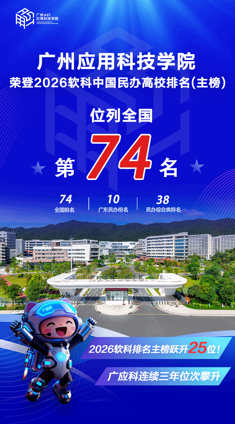 近日,高等教育专业评价机构软科正式发布“2026软科中国大学排名”。在备受关注的中国民办高校排名(主榜)中,广州应用科技学院(以下简称“广应科”)凭借强劲的发展势头与扎实的办学实力,位列全国第74名,位列全国民办综合类大学第38名,位列广东民办高校第10名。