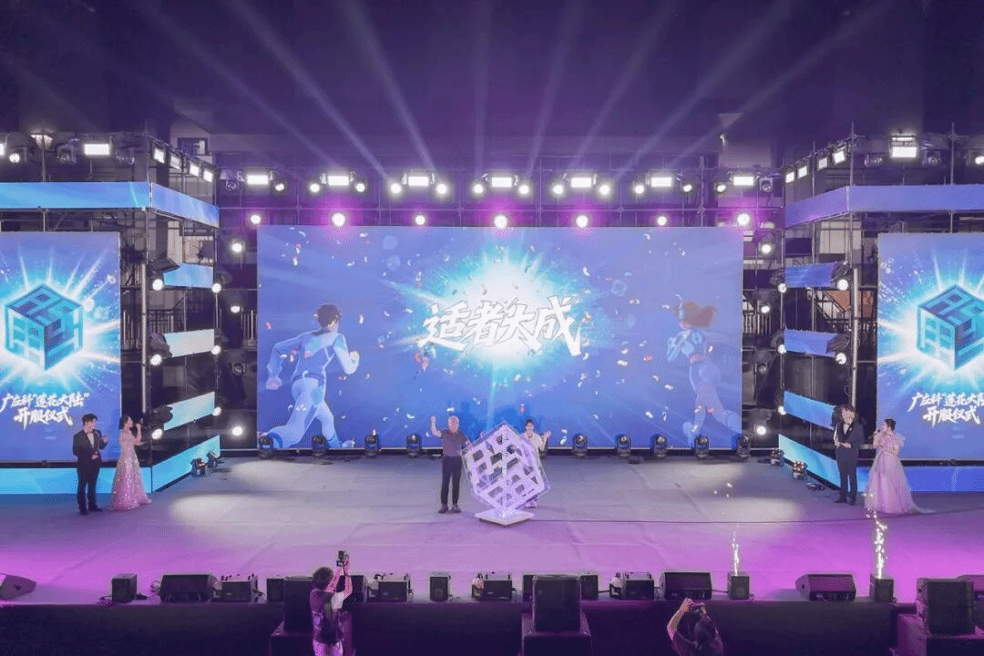 ▲ 2025年9月22日,广州应用科技学院品牌发布暨2025级新生文艺晚会上,张光宇校长与新生代表共同点亮广应科“适者大成”核心理念和新校徽。